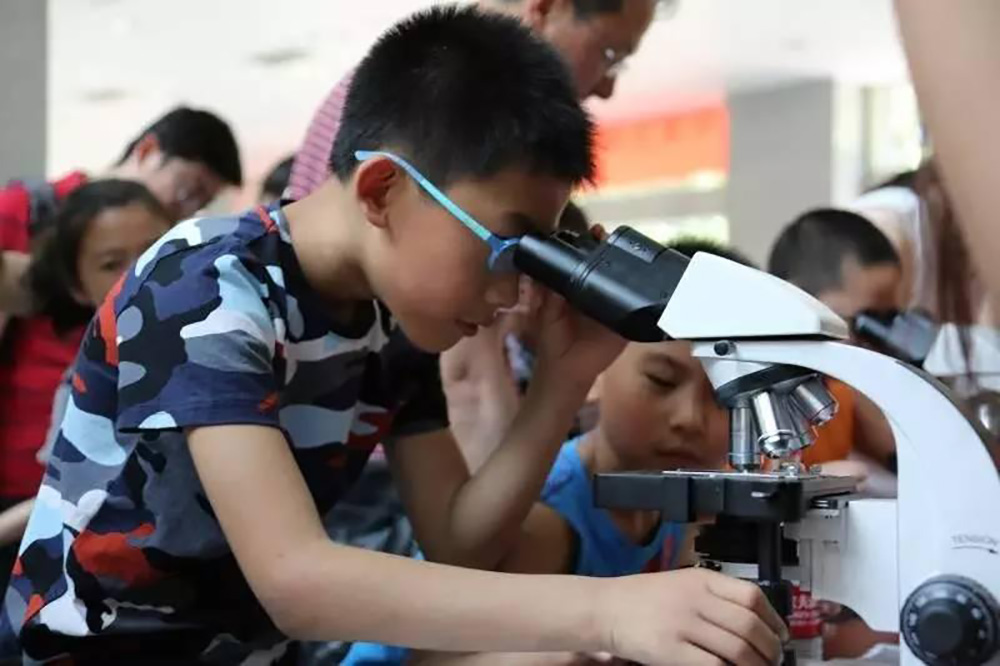 參觀的學生在觀察水中的微生物